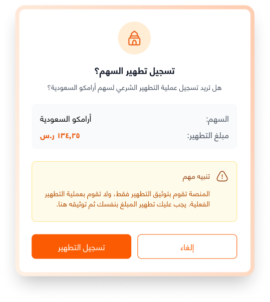 ابدأ الآن مجاناًنساعدك على حساب المبالغ الواجب تطهيرها من أرباح الأسهم التي تحتوي على دخل غير متوافق مع الشريعة الإسلامية، بناءً على أحدث الفتاوى والضوابط الشرعية.